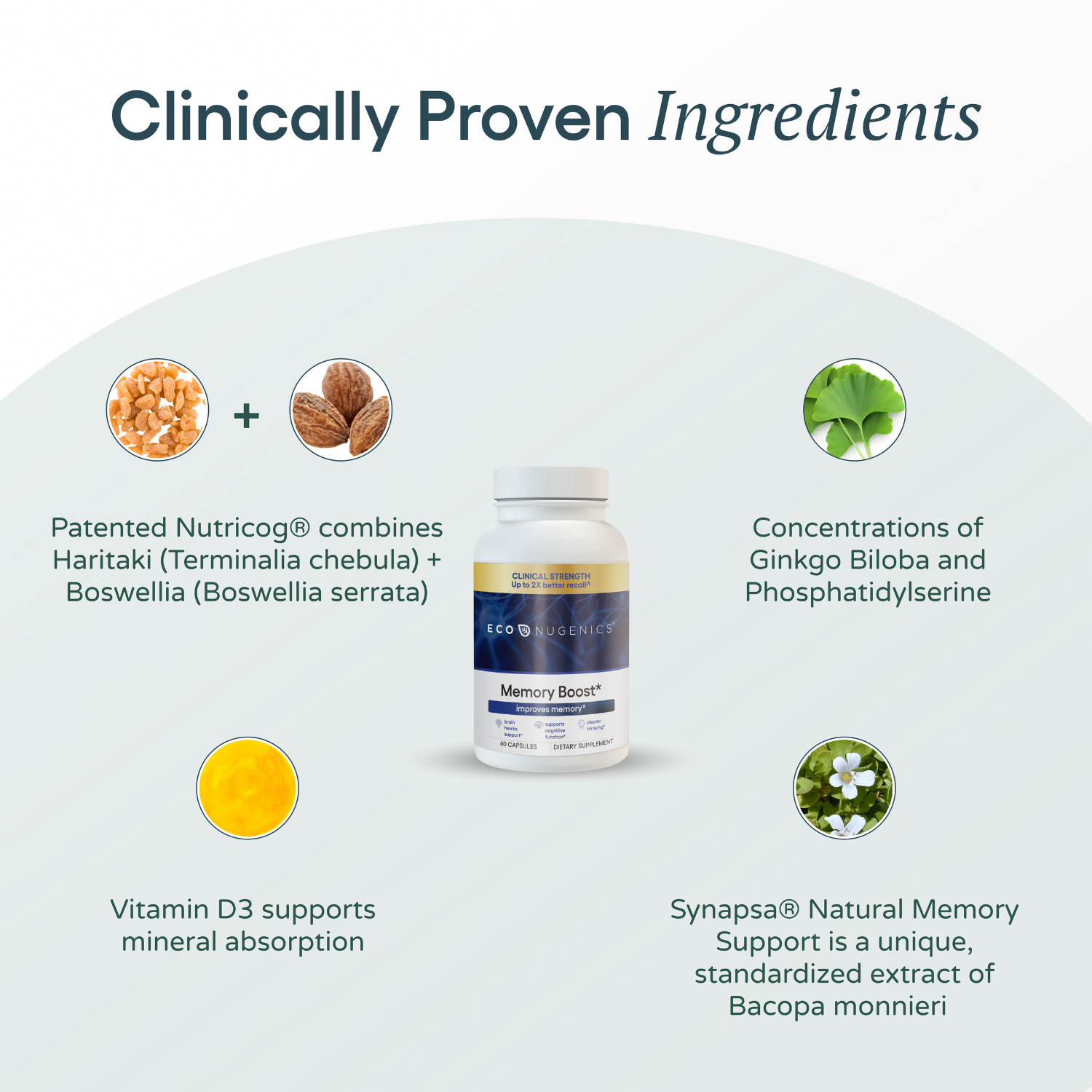 Synapsa® Bacopa (Bacopa monnieri) extract, Nutricog® Indian frankincense (Boswellia serrata) gum resin extract and Haritaki (Terminalia chebula) fruit extract, Ginkgo biloba leaf extract